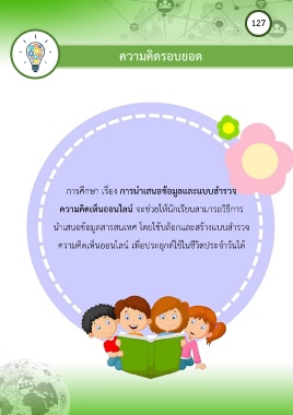 127 ความคิดรอบยอด การศึกษา เรื่อง การนำเสนอข้อมูลและแบบสำรวจ ความคิดเห็นออนไลน์ จะช่วยให้นักเรียนสามารถวิธีการ นำเสนอข้อมูลสารสนเทศ โดยใช้บล็อกและสร้างแบบสำรวจ ความคิดเห็นออนไลน์ เพื่อประยุกต์ใช้ในชีวิตประจำวันได้