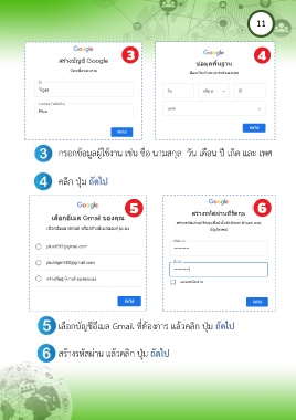 11 กรอกข้อมูลผู้ใช้งาน เช่น ชื่อ นามสกุล วัน เดือน ปี เกิด และ เพศ คลิก ปุ่ม ถัดไป เลือกบัญชีอีเมล Gmail ที่ต้องการ แล้วคลิก ปุ่ม ถัดไป สร้างรหัสผ่าน แล้วคลิก ปุ่ม ถัดไป