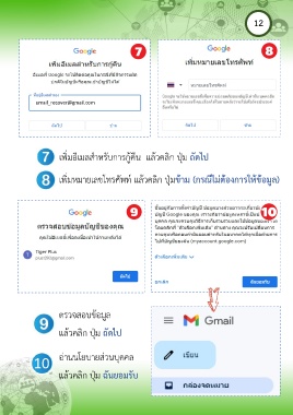 12 umail_recover@gmail.com เพิ่มอีเมลสำหรับการกู้คืน แล้วคลิก ปุ่ม ถัดไป เพิ่มหมายเลขโทรศัพท์ แล้วคลิก ปุ่มข้าม (กรณีไม่ต้องการให้ข้อมูล) ตรวจสอบข้อมูล แล้วคลิก ปุ่ม ถัดไป 10 อ่านนโยบายส่วนบุคคล แล้วคลิก ปุ่ม ฉันยอมรับ