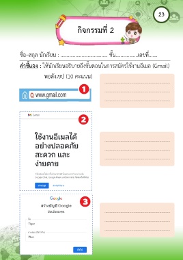 23 กิจกรรมที่ 2 ชื่อ–สกุล นักเรียน : …………………….…………. ชั้น………………เลขที่……. คำชี้แจง : ให้นักเรียนอธิบายถึงขั้นตอนในการสมัครใช้งานอีเมล (Gmail) พอสังเขป (10 คะแนน)