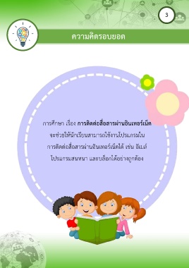 3 ความคิดรอบยอด การศึกษา เรื่อง การติดต่อสื่อสารผ่านอินเทอร์เน็ต จะช่วยให้นักเรียนสามารถใช้งานโปรแกรมใน การติดต่อสื่อสารผ่านอินเทอร์เน็ตได้ เช่น อีเมล์ โปรแกรมสนทนา และบล็อกได้อย่างถูกต้อง